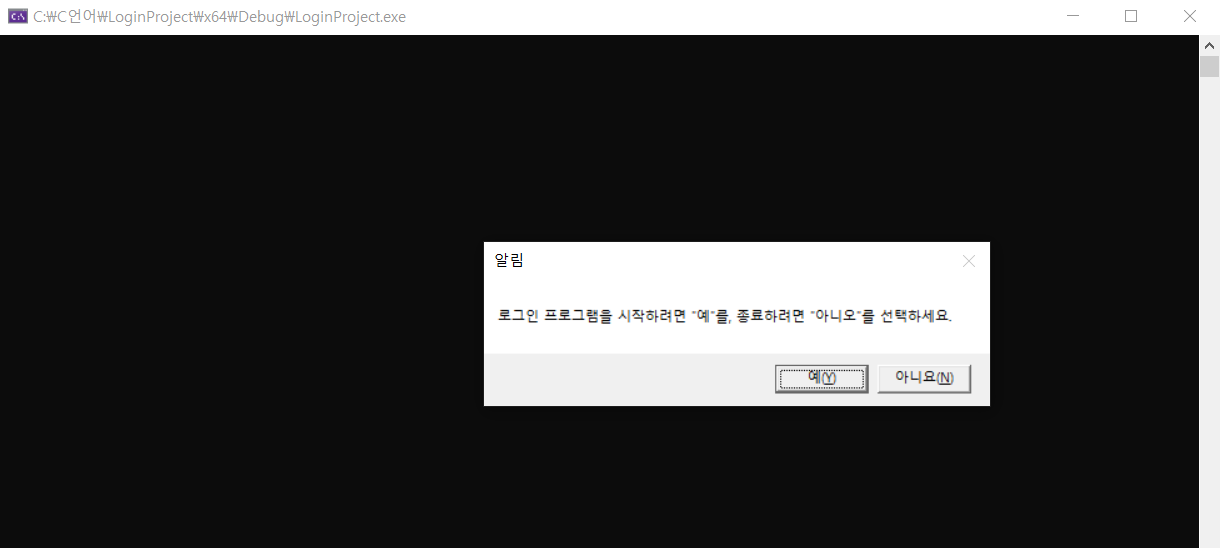 int result = MessageBoxA(NULL, "로그인 프로그램을 시작하려면 \"예\"를, 종료하려면 \"아니오\"를 선택하세요.", "알림", MB_YESNO);
