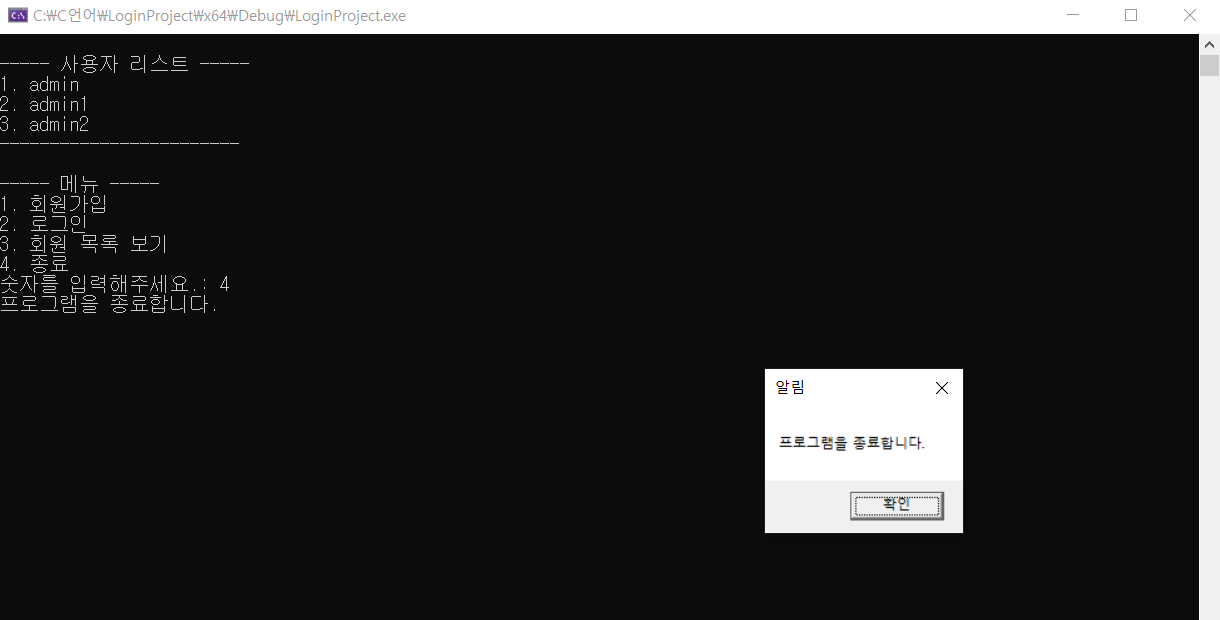 int result = MessageBoxA(NULL, "프로그램을 종료합니다.", "알림", MB_OK);